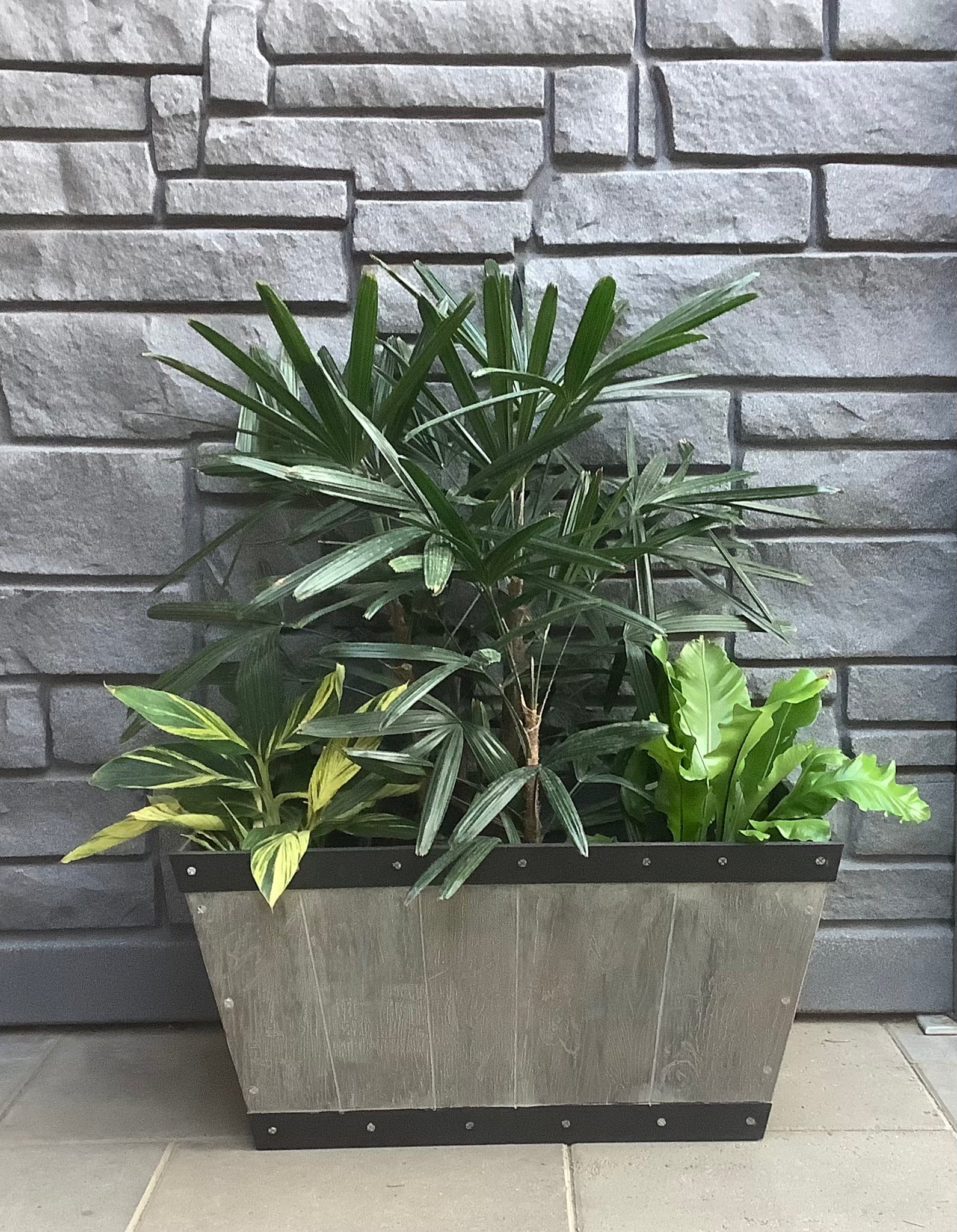 Plastic rectangle pot. Rustic looking, perfect for indoor and outdoor plants. 11" x 15" W, 19" x 10 1/4" B, x 12" HPlants sold separately.