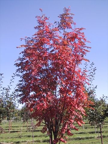 Pyramidal Mountain Ash (Sorbus aucuparia 'Pyramidal') is an attractive deciduous tree known for its distinctive pyramidal shape and vibrant foliage. In spring, it bursts forth with clusters of white flowers, which later give way to small red berries that persist into winter, providing food for birds. The compound leaves are dark green, turning to shades of yellow, orange, and red in autumn, creating a stunning display of fall color. This compact tree makes it an excellent choice for smaller landscapes or as a focal point in larger gardens.